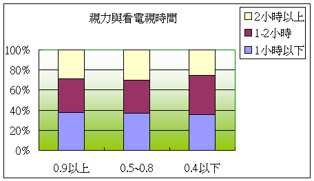 說明:由圖可知,視力正常的學生上安親班的比例最低,0.4以下學生則比例最高,顯示在安親班中,應避免眼睛疲勞。 五、學生視力與看電視時間的百分比: 說明: 學生看電視時間以一小時以下比例最高,2小時以上比例最低,本圖沒有明顯的趨勢顯示看電視時間和視力狀況有相關。