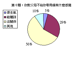 解釋:由圖表可以看出父母每天給零用錢的佔全部的37%,有80人。其次是一星期給一次佔全部的30%,有65人。所以大部分的父母幾乎每過一星期就會給孩子零用錢,不會隔太久的時間。